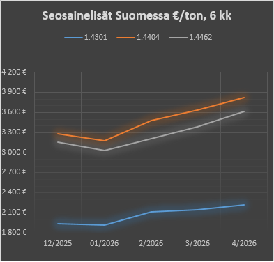| 1.4404 | 3179 €/ton | 3482 €/ton | 3639 €/ton | 3825 €/ton |
